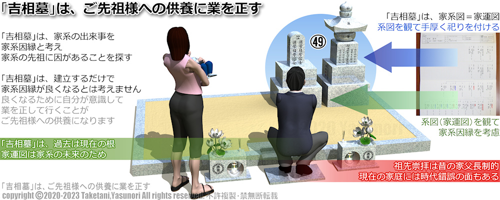 「吉相墓」は、過去は現在の根と言い、家系の出来事を家系因縁と考えます。家系の先祖に因があることを探しますが、霊が祟っているとかは言いません。因縁が良くなる行為をするのは、根である先祖への供養であり、先祖の成仏が進んで、業が浄化がされたと考えられる。だから家運が安定し、枝葉の子孫が良くなり成果が得られると考えます。