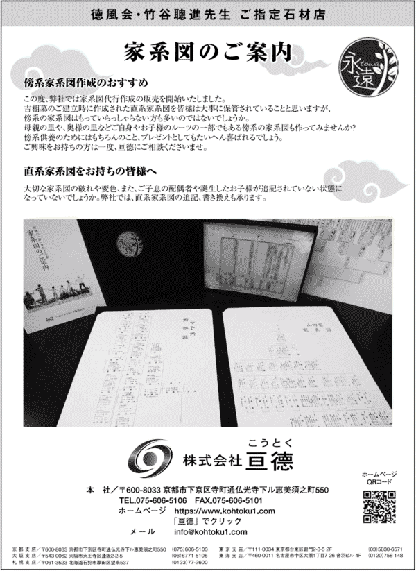 世界の神話には神々の系図が、聖書にはキリストの系図が、我が国の神話には神々と天皇家の系図が明らかにされています。家系図は自分の家系を明らかにし、先祖の祭祀に必要な情報が詰まっています。家系図を基にして家で祀るべき先祖、家の外で供養を施す絶家・傍系、家系の因縁、戒名に付いて等の判断をして徳風会吉相墓を設計しますので、正確な家系図が必要です。
